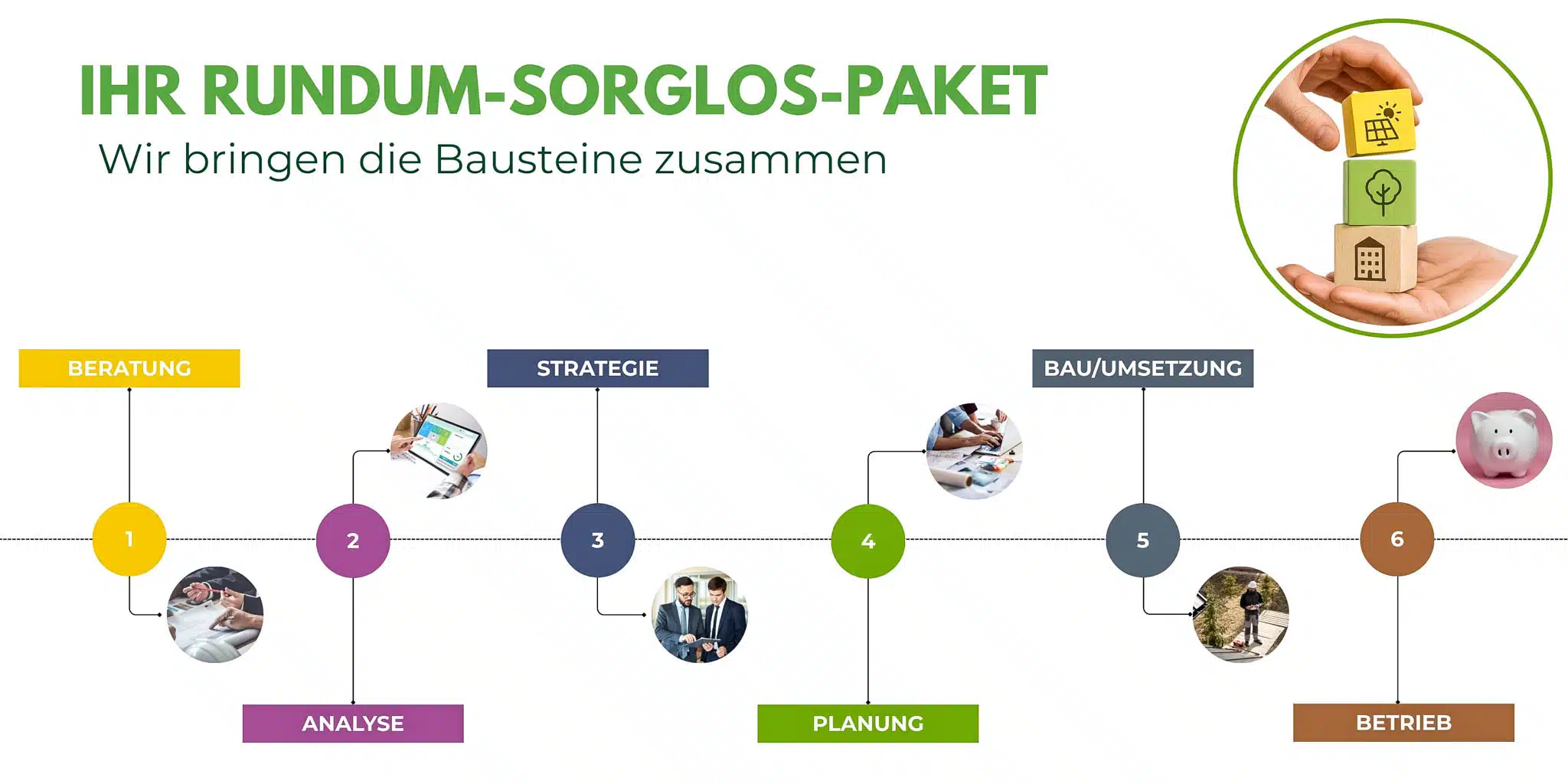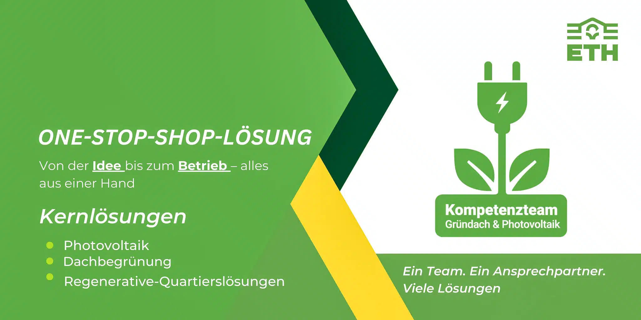 Wenn Sie PV-, Gründach- und weitere klimaresiliente Maßnahmen effizient, rechtssicher und wirtschaftlich umsetzen wollen, sind Sie hier richtig. Wir bündeln Fachwissen, Erfahrung und Umsetzungsstärke aus Photovoltaik, Dachbegrünung, klimaresilienter Quartiersplanung und regenerativen Energielösungen. Wir übernehmen entweder den vollständigen Prozess oder unterstützen Sie gezielt in einzelnen Leistungsphasen.